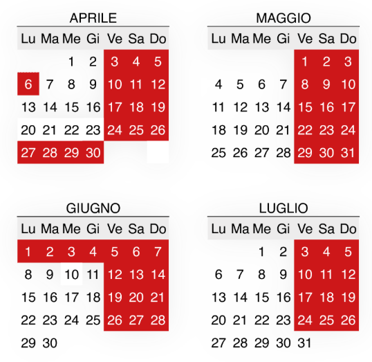 - Mai 2026: 1, 2 ,3, 8, 9, 10, 15, 16, 17, 22, 23, 24, 29, 30, 31